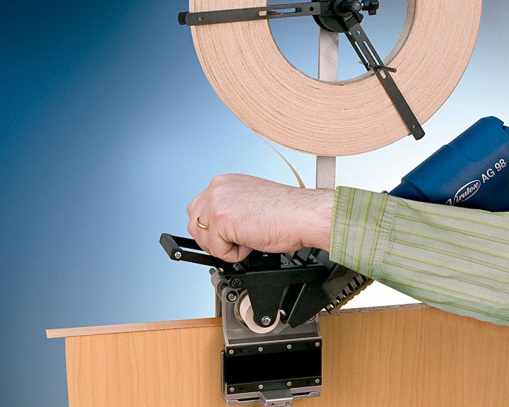 The unit applies heat direct to preglued edging material ensuring the best possible application and bonding. A set of rubber clamps hug the board so you can get the most accurate tracking of the tape on the board. This hand held portable edgebander it's perfect for circular and shaped pieces with a minimum internal radius of 20mm. Its easy adjustment and application makes it the best portable edgebander on the market.