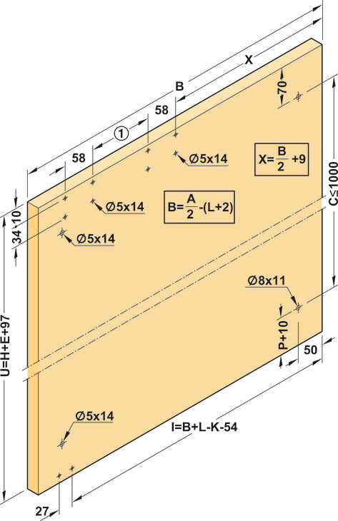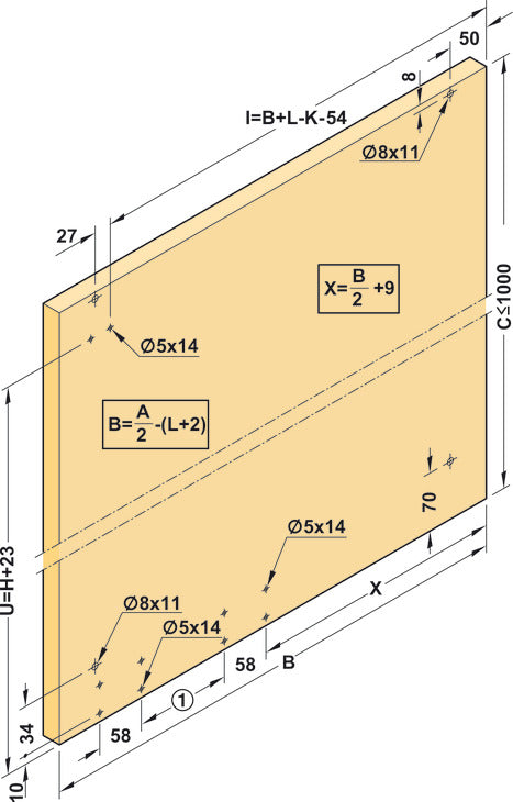 - Cabinet version: wall units, sideboards, base units, with 2 symmetrical door leaves or for one single doors and drawers, for example