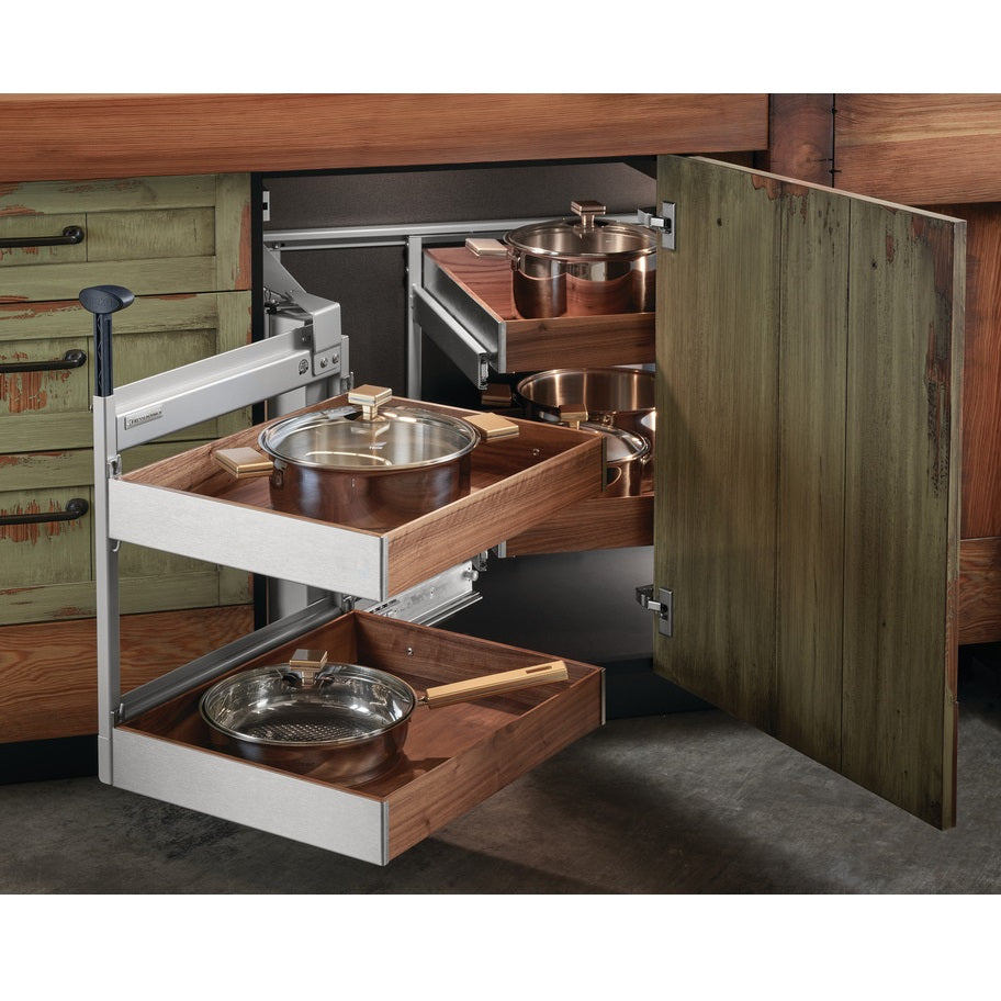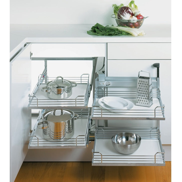 The Peka Magic Corner II represents the next evolution in blind corner storage solutions. This sophisticated system features a smooth pull-out and swivel motion that brings the front trays completely clear of the cabinet opening. As the front trays move, the back trays are simultaneously brought forward. The key innovation is that the back trays can then slide forward individually, providing total, unimpeded access to all their contents. Built on a robust, powder-coated steel frame with integrated soft-close, the Magic Corner II offers superior functionality and a high-end user experience.
