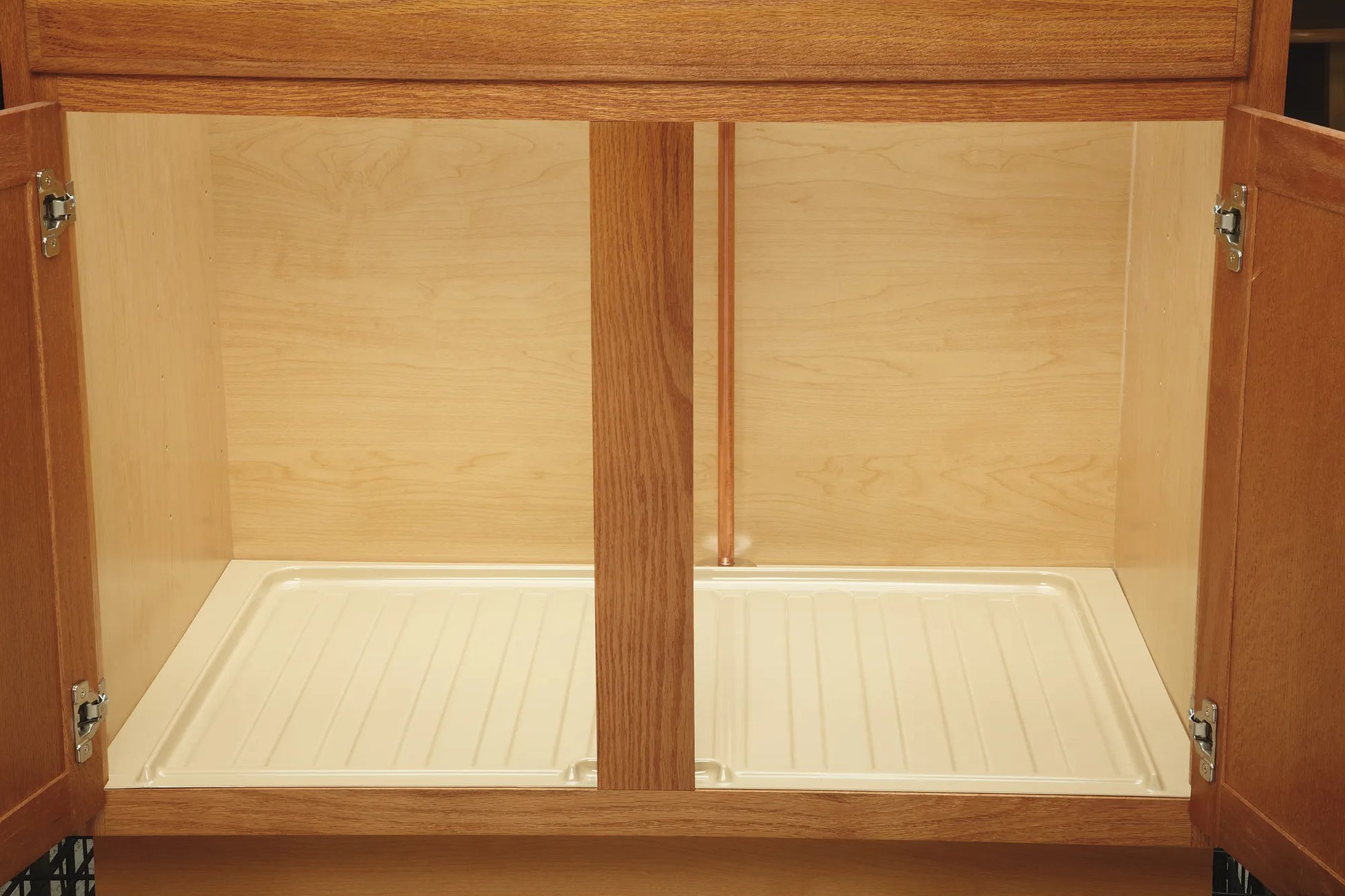 The SBDT is your first line of defense against under sink cabinet damage from minor leaks. The unique design not only protects the bottom of your cabinet by holding water the tray actually funnels excessive water to the front of your cabinet and out onto the floor alerting you of the leak. The series is available in three sizes designed for installation in 30", 36" or 40" sink base cabinet construction They are easy clean up and resistant to most household chemicals.