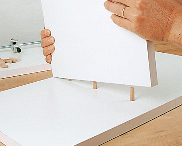 For joining 16 and 19 mm boards using blocks (Ø 8 mm) or screws. High quality finish with no need for later adjustment. Any type of joint can be made, either square jointing or centre board jointing. Ideal for various professional uses such as: small jobs, making small orders, adjustments, repairs etc. The standard kit includes the following items: supplements for 16 mm boards, reducer screws and stop for chuck.